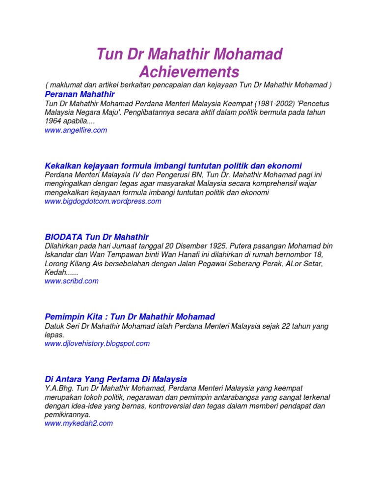 Kepimpinan tiga orang Perdana Menteri yang terdahulu Malaysia berada di. Sumbangan dan kejayaan Tun Mahathir. Sumbangan Tun Dr Mahathir Mohamad mantan Perdana Menteri Malaysia yang ke-4.